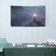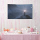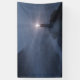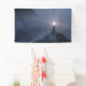 Un faro con una cruz mientras la luz brilla sobre las rocas y los rompientes de una orilla cubierta de niebla, mostrando a los barcos entrantes el camino a la seguridad.
