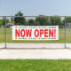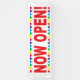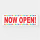 AHORA ABRIR la señal con un colorido borde inclinante y un gran tipo rojo. Banner de Rótulo de Apertura Comercial para anunciar que una nueva empresa abre o una ubicación.