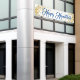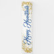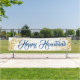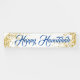 Este banner de vacaciones se muestra en el estilo exterior con grommets. Seleccione entre interior o exterior, con o sin mangas. Mostrado en blanco con el texto azul "Happy Hanukkah" en un guión elegante con dos estrellas de aspecto dorado en cada extremo. Personalizar o compra según el diseño.
