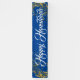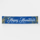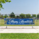 Este banner de vacaciones se muestra en el estilo exterior con grommets. Seleccione entre interior o exterior, con o sin mangas. Mostrado en azul con el texto en blanco "Happy Hanukkah" en un guión elegante con dos estrellas de aspecto dorado en cada extremo. Personalizar o compra según el diseño.