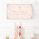 Un diseño religioso para el bautizo de un chica. El fondo es rosa. Hay un marco falso rosa de Relieve metalizado dorado vintage y (falso) cruz de oro rosa encima del texto. El mensaje "Bienvenidos a [Name]'s" está escrito en un guión caligráfico elegante, el resto en mayúsculas. Todo el texto es rosado. El marco vintage, ornamentado, se basa en un enlace de portada de libros antiguos franceses, de Georges Mercier (1885-1939) - Madame de Maupin por Theophile Gautier, edición 1911, ahora de dominio público.