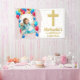 Este diseño de cumpleaños y bautizo será genial para la fiesta de tu pequeña. El lado del primer cumpleaños presenta una foto de tu hijo sobre un fondo de acuarela rosa con lunares blancos y globos de colores. En el lado del bautismo hay texto dorado con una cruz dorada y el nombre de tu hijo sobre confeti de acuarela rosa. ¡Esto hará un gran telón de fondo para fotos!