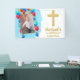 Este diseño de cumpleaños y bautizo será genial para la fiesta de tu pequeño. El lado del primer cumpleaños presenta una foto de tu hijo sobre un fondo de acuarela azul con lunares blancos y globos de colores. En el lado del bautizo hay texto dorado con una cruz dorada y el nombre de tu hijo sobre confeti de acuarela azul. Esto hará un gran telón de fondo para fotos.