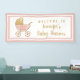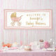 Bienvenido a tu ducha de bebé con esta bonita pancarta de una ducha de bebé con un carrito de bebé retro rosa pastel y dorado y el nombre de la futura madre en un guión elegante. Puedes personalizar el texto del carro con el nombre o el sexo del bebé ("¡Es un Chica!") o dejar en blanco.