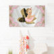 Banderín para baby shower de niña con una adorable bebé de pelo rubio claro que lleva un tutú rosa y collar de perlas sentada en un par de zapatos de tacón alto de purpurina dorada sobre un bonito fondo de satén rosa y dorado. Este adorable banderín para baby shower en rosa y dorado se personaliza fácilmente para tu evento añadiendo texto en el estilo de letra que elijas. Puedes mover a la bebé y los zapatos según necesites. Este es un diseño impreso sin purpurina real, satén, perlas, etc.