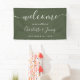 Esta tarjeta de bandera de bienvenida de boda de guion de color verde oliva de moda se puede personalizar con sus nombres y fecha especial. Diseñado por Thisisnotme©