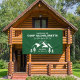 Bandera de bienvenida a Camp Bachelorette con montañas y un bosque en colores verde y blanco. Personalízala con el nombre de la futura novia, fecha establecida, ubicación y cualquier mensaje que desees agregar. El ejemplo dice "Último sendero antes del velo".