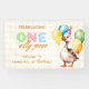 Un tonto tema de primer cumpleaños, género neutro, niño, chica, cartel de bienvenida de cumpleaños con una linda gansa de color agua con un gorra fiesta y globos en un suave fondo de manto de gingham amarillo.
