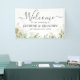 Pancarta de bienvenida boda botánico con un fondo blanco elegante, un follaje de eucalipto verde acuarela, acentos purpurinas dorados y una plantilla de texto boda que es fácil de personalizar.