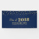 Este moderno banner de bienvenida es perfecto para un fiesta de reuniones de clase dorada y azul marino de moda. Un elegante cartel de fiesta personalizado para recordar su día especial. El diseño presenta el texto en color oro personalizado " Clase de Reunión 2018 / 10 años " con fondo de confeti. Puede personalizar el texto con su propia información. (año de graduación, año de reunión, nombre escolar, etc.)
