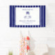 Un banner de bienvenida para despedida de soltera con un estilo moderno pero inspirado en el retro, que presenta rayas azules y blancas para un ambiente náutico y fresco. El título principal dice "The Bach Club" en una llamativa combinación de tipografía sans-serif moderna y escritura vintage, equilibrando la claridad minimalista con la elegancia clásica. En el centro, una ilustración de una palmera dibujada a mano ancla el diseño, flanqueada por dos conchas de mar a cada lado, lo que añade un toque de encanto costero de dinero antiguo y vibraciones de lujo junto al mar. La estética general combina el lujo clásico con el diseño minimalista, evocando una apariencia atemporal pero fresca que se siente perfecta para una celebración chic en la playa.