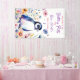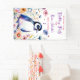 Un pingüino lindo rodeado de flores rosas, azules, naranjas y moradas color agua ilustracion fiesta de cumpleaños chica de bienvenida Banner.