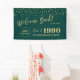 Este moderno banner de bienvenida es perfecto para una elegante fiesta de reunión de clase de color verde oscuro y dorado. Un banner de fiesta personalizado y elegante para recordar tu día especial. El diseño presenta tipografía dorada "¡Bienvenidos de nuevo!" con fondo de confeti. Puedes personalizar el año de graduación, nombre de la escuela y fecha del evento.