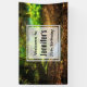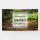 Pancarta de bienvenida de cumpleaños con un bosque verde brillante con una cala sinuosa de bonito. Las hojas marrones cubren el suelo del bosque, lo que aporta un agradable contraste con la exuberante vegetación de estos mágicos bosques.
