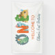 Pancarta de bienvenida de los dinosaurios de la fiesta de cumpleaños moderna. Características de diseño número uno guión tipográfico e iconos de dinosaurios. Personaliza con un nombre. Perfecto para el tema Dino fiesta.