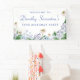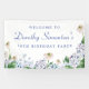 Un bonito cartel de bienvenida con el factor Wow que impresionará a los clientes. Las hortensias azules y violetas suaves se mezclan con rosas silvestres blanquecinos blanquecinos y blanquecinos. El nombre del celebrante de cumpleaños está escrito en un tipo de letra de guión fácil de leer. el año de cumpleaños sigue en negrita un tipo de letra serif tradicional. Todo el texto es editable para que pueda personalizar su bienvenida.