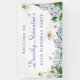 Un bonito cartel de bienvenida con el factor Wow que impresionará a los clientes. Las hortensias azules y violetas suaves se mezclan con rosas silvestres blanquecinos blanquecinos y blanquecinos. El nombre del celebrante de cumpleaños está escrito en un tipo de letra de guión fácil de leer. el año de cumpleaños sigue en negrita un tipo de letra serif tradicional. Todo el texto es editable para que pueda personalizar su bienvenida.