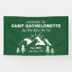 Bandera de bienvenida a Camp Bachelorette con montañas y un bosque en colores verde y blanco. Personalízala con el nombre de la futura novia, fecha establecida, ubicación y cualquier mensaje que desees agregar. El ejemplo dice "Último sendero antes del velo".
