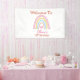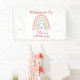 Esta es una bonita pancarta de bienvenida de cumpleaños color arcoiris pastel. El arcoiris está decorado en tonos pastel azules, rosas y amarillos, con corazones. Puede personalizar del diseño haciendo clic en el botón de personalización