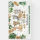 Pancarta de bienvenida con temática safari con vegetación tropical de color agua verde y dorada y un grupo de bonitos animales de la selva. Personalizar la redacción que se adapte a tu ocasión, por ejemplo, ducha de bebé, bautismo, cumpleaños, día de nombres, bautizo, etc.