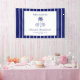 Un banner de bienvenida para despedida de soltera con temática playera moderna y retro, que presenta rayas azules y blancas para un ambiente náutico y fresco. El título principal dice "The Bach Club" en una llamativa combinación de tipografía sans-serif moderna y escritura vintage, equilibrando claridad minimalista con elegancia clásica. En el centro, una ilustración de una palmera dibujada a mano ancla el diseño, flanqueada por dos conchas de mar a cada lado, lo que agrega un toque de encanto costero de dinero viejo y vibraciones de lujo junto al mar. La estética general combina el lujo clásico con el diseño minimalista, evocando una apariencia atemporal y fresca que se siente perfecta para una celebración chic en la playa.