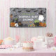 El banner lindo de la ducha de bebé de Halloween con un bebé es tema de elaboración con un fantasma de bruja, un caldero que prepara algo verde y burbujeante, dos gatos y calabazas y un cráneo y un cuervo, murciélagos voladores y hongos y arañas en una paleta de colores neutros de Halloween de género. Pancarta de la ducha de bebé de Halloween neutral de género con un bebé se está preparando con ilustraciones espeluznantemente lindos.