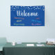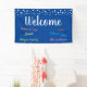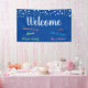 Cartel de bienvenida con seis nombres en texto de personalizable completo (o añadir más si lo desea). Círculos de confetti y estrellas en la parte superior. Cambie el fondo azul a otro color si lo desea. Bienvenidos a un grupo de visitantes o invitados con una divertida pancarta.