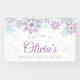 Invierno de Onederland primer cumpleaños cartel de bienvenida con copos de nieve morados, azules y plateados