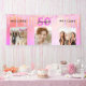 Para un cumpleaños número 50 (o cualquier edad) como un banner de bienvenida fiesta o decoración en las paredes. Un collage de 3 de tus fotos de ella misma amigos, familia, intereses o mascotas. Personalice y añada su nombre, edad 50 y fecha. Fecha de nacimiento o fecha de la fiesta de cumpleaños. La palabra: Bienvenidos (x2) Un fondo de diseño morado, rosa y oro rosa. Decorada con goteo purpurina, pinturas de goteo. Texto de color rosa y negro caliente.