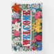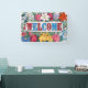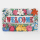 Este es un colorido dibujo de acuarela vintage de rosas, lirios y otras flores de jardín con una inscripción "Welcome" roja y azul en el centro.