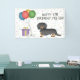 Diseño temático de cumpleaños lindo con el original ilustracion personalizado de Destei de un perro de raza Dachshund de color negro y color crema de abrigo tostado. Al lado del perro hay globos de cumpleaños coloridos atados sobre un hueso de perro y una caja de regalo de color morado y amarillo. El fondo está decorado en tonos pastel y con un fondo blanco. También hay un área de texto personalizable.