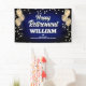 Fun banner sign for indoors or out, featuring festive gold metallic balloons on both sides of the design with sparkly, gold metallic confetti on a rich textured blue background for your personalized retirement party banner.