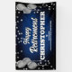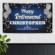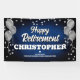 Fun banner sign for indoors or out, featuring festive silver metallic balloons on both sides of the design with sparkly, silver metallic confetti on a rich textured blue background for your personalized retirement party banner.