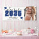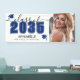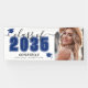 This classic yet modern graduation party banner is the perfect way to celebrate the Class of 2026. The design is arranged with the graduation details on the left side, featuring “Class of 2026” with the year highlighted in blue for a bold pop of color, accented with elegant gray script. Two graduation cap icons in blue add a festive touch, while space below allows for the graduate’s name and school, creating a personalized centerpiece for the celebration.