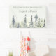 Bienvenido a su casa de montaña o boda de bosques con este banner personalizado. Su estilo es sencillo pero elegante, con un acento ilustracion de un bosque acuático de pinos altos o de árboles perennes en tonos verde salvia, gris y verde pálido. La suave acuarela tiene una tranquilidad de calidad que recuerda a la presencia de la niebla sobre un cristal arbolado. Las letras clásicas y elegantes de un verde sabio oscuro que coordina deletrean los nombres de la novia y del novio.
