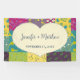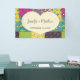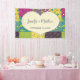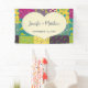 Cree un banner personalizado para usar para señalización o fondo en su boda. Este cartel presenta un gráfico de forma de corazón de color crema con acentos de coser falsos que están listos para ser personalizados con los nombres de la novia y el novio y su fecha boda. El corazón se inclina sobre un colorido tejido de mosaico de colores.
