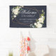 Moderna y de moda, esta pancarta de bienvenida boda presenta un falso cobre geométrico adornado con acuarelas florales de color blanco y eucaliptos verdes, de textura azul marino moderna. Copyright Elegant Invita. Todos Los Derechos Reservados.