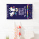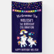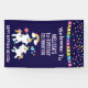 Una pancarta de cumpleaños con 2 hermosos unicornios bailando con colas brillantes y coloridas, y hombres. Un arcoíris colorido con nubes en cada lado sobre sus cabezas. Otros elementos son una flor, un corazón y algunas estrellas. Fondo morado oscuro. Coloridos puntos de confeti y una concha de imagen a lo largo de la parte superior.