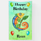 Esta pancarta de tela es azul y verde con un colorido y brillante lagarto sonriente en naranja, amarillo, azul y verde sosteniendo un palo con una hoja rodeada de globos festivos con correas. Personalizar el texto Feliz Cumpleaños y tu nombre con las plantillas.