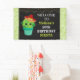 Una pancarta de cumpleaños con un bonito ilustracion de un cañón y un cactus verde redondo, con grandes ojos kawaii, sonrientes y con un sombrero rojo. Parado dentro de una maceta de flores. La parte superior está decorada con rociadas de helados de colores. El fondo es una imagen de pizarra negra con hileras verdes a lo largo de la frontera.