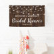 Pancarta de ducha de moda de campo con fondo rústico de madera de grano, luces de cuerdas y una plantilla de texto de fiesta nupcial. Haga clic en el botón "Personalizar" para obtener más información sobre esta plantilla. Podrá modificar todo el texto, incluidos el estilo, los colores y los tamaños. Es perfecto para una ducha de boda rústica, rural, occidental, de rancho, granero, viñedos o patio trasero.