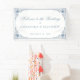 Banner elegante de bienvenida nupcial con un aire vintage, con colores bodas polvorientos azules y blancos. En las esquinas hay un marco vintage con decoraciones antiguas. El mensaje "Bienvenidos al Boda" está escrito en un elegante guión caligráfico, el resto en mayúsculas. El texto y el marco antiguo son azul polvoriento, el fondo es blanco. El marco vintage, ornamentado, se basa en un enlace de portada de libros antiguos franceses, de Georges Mercier (1885-1939) - Madame de Maupin por Theophile Gautier, edición 1911, ahora de dominio público.