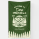 Bandera de bienvenida de campamento de despedida de soltera en verde con el nombre personalizado del campamento de la futura novia y la ubicación, la forma perfecta de iniciar un fin de semana al aire libre entre chicas y guiar a los invitados al campamento base en un retiro de cabaña, una escapada de glamping en la montaña, una escapada a una casa de lago o una aventura en un parque nacional. Con un gráfico audaz de la naturaleza con líneas editables para el nombre del campamento de la novia, el año y el destino, esta señal de bienvenida personalizada te ayuda a darle una identidad al fin de semana de despedida de soltera desde el momento en que todos llegan, mientras que mantiene la orientación simple para el check-in, la entrega de equipo y los puntos de encuentro. Úsala en la entrada del lodge, la puerta de la casa de huéspedes, el pabellón del campamento, el punto de encuentro en el sendero, la barra de s'mores o el lugar para fotos; también se coordina fácilmente con invitaciones, tarjetas de itinerario, etiquetas de favores, sombreros e inserciones de bolsas de bienvenida a juego para un tema cohesivo de campamento de despedida de soltera. El arte inspirado en la naturaleza se adapta a estilos rústicos chic, vintage modernos, carteles de parques nacionales, cabin-core y de aventura de despedida de soltera, lo que lo hace versátil para itinerarios que incluyen senderismo
