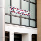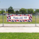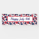 Este banner de vacaciones del 4 de julio se muestra en el estilo al aire libre, Seleccionar desde interior o exterior, con o sin mangas. Mostrado en una bandera patriótica con el texto Feliz 4 de Julio en azul. Personalizar o compra según el diseño. Imagen de stock