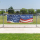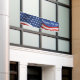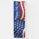 Este banner de vacaciones del 4 de julio se muestra en el estilo al aire libre, Seleccionar desde interior o exterior, con o sin mangas. Mostrado en una huella patriótica de la bandera de Estados Unidos con texto del 4 de julio feliz en blanco. Personalizar o compra según el diseño. Imagen de stock