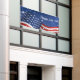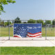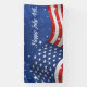 Este banner de vacaciones del 4 de julio se muestra en el estilo al aire libre, Seleccionar desde interior o exterior, con o sin mangas. Mostrado en una huella patriótica de la bandera de Estados Unidos con texto del 4 de julio feliz en blanco. Personalizar o compra según el diseño. Imagen de stock