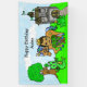El Principito con corona y espada, y su caballo mascota, dragón y rana con un castillo y árbol con un búho en el fondo, pancarta personalizada de cumpleaños. Príncipe étnico afroamericano, hispano o indio.