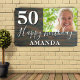 Cartel de la fiesta de cumpleaños número 50 de Rustic Wood Photo. Gran señal para la fiesta de cumpleaños número 50 con una foto personalizado, texto en escritura de moda con un nombre. El fondo es de madera oscura y el texto es de color blanco. Personaliza el cartel con tu foto, tu nombre y la edad y haz tu propio banner de fiesta de cumpleaños.