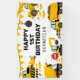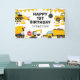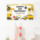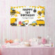 Banner de cumpleaños con temática de construcción con un fondo blanco simple, con lindos ilustraciones personalizados de racimo, carteles de stop, un camión de basura, una excavadora, un camión de cemento, una grúa de bola que estropea, manchas de suciedad y una plantilla de feliz cumpleaños que es fácil de personalizar.
