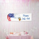 Este banner de vacaciones del 4 de julio se muestra en el estilo interior, Seleccione desde dentro o fuera, con o sin mangas. Mostrado en una huella de águila de la bandera estadounidense patriótica con texto del 4 de julio feliz en azul. Personalizar o compra según el diseño. Imagen de stock